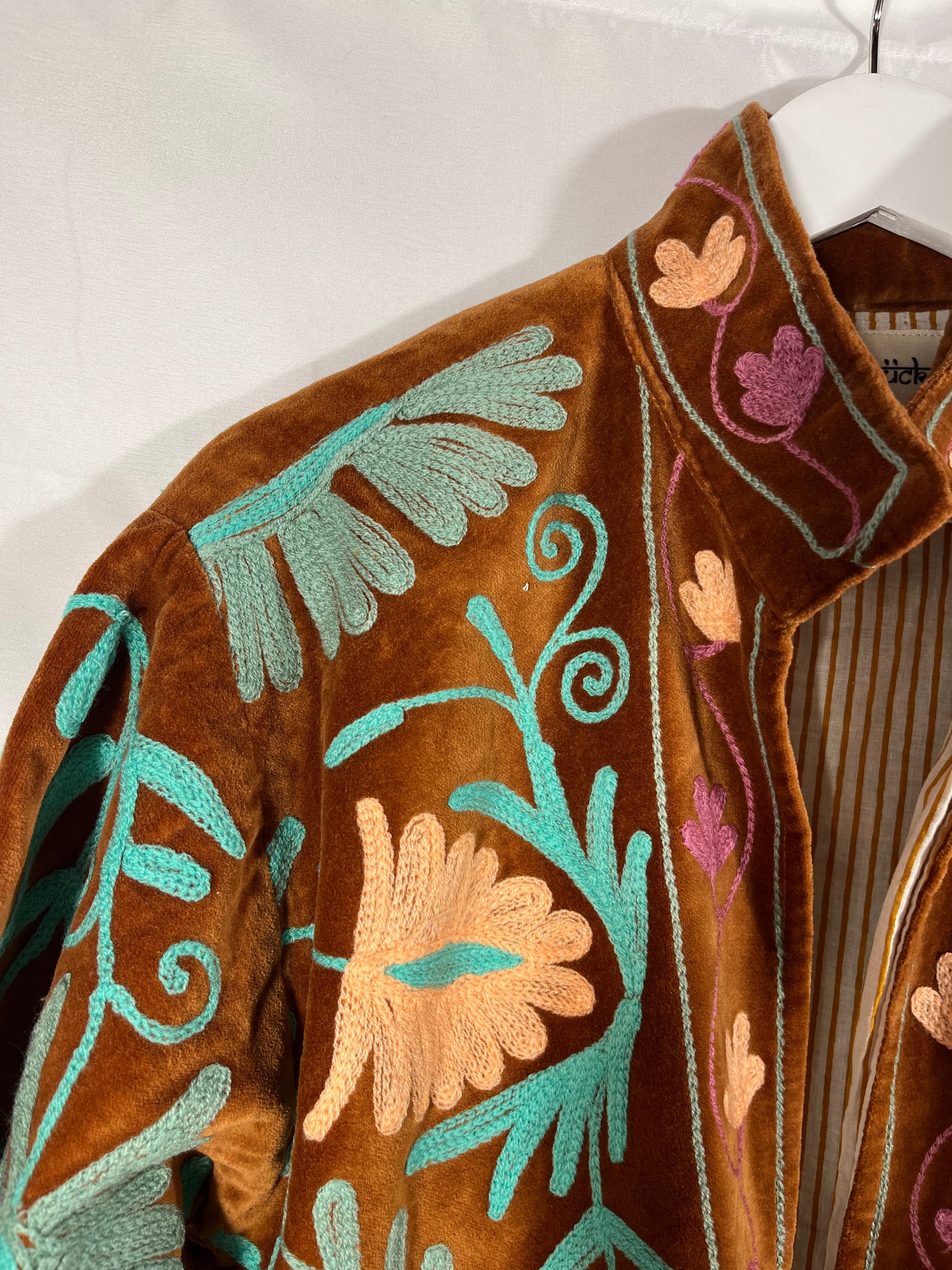 Dieses Einzelstück ist genäht aus einem alten bestickten Suzani. Die Jacke hat zwei Taschen und das Innenfutter ist aus weicher gestreifter Baumwolle.
