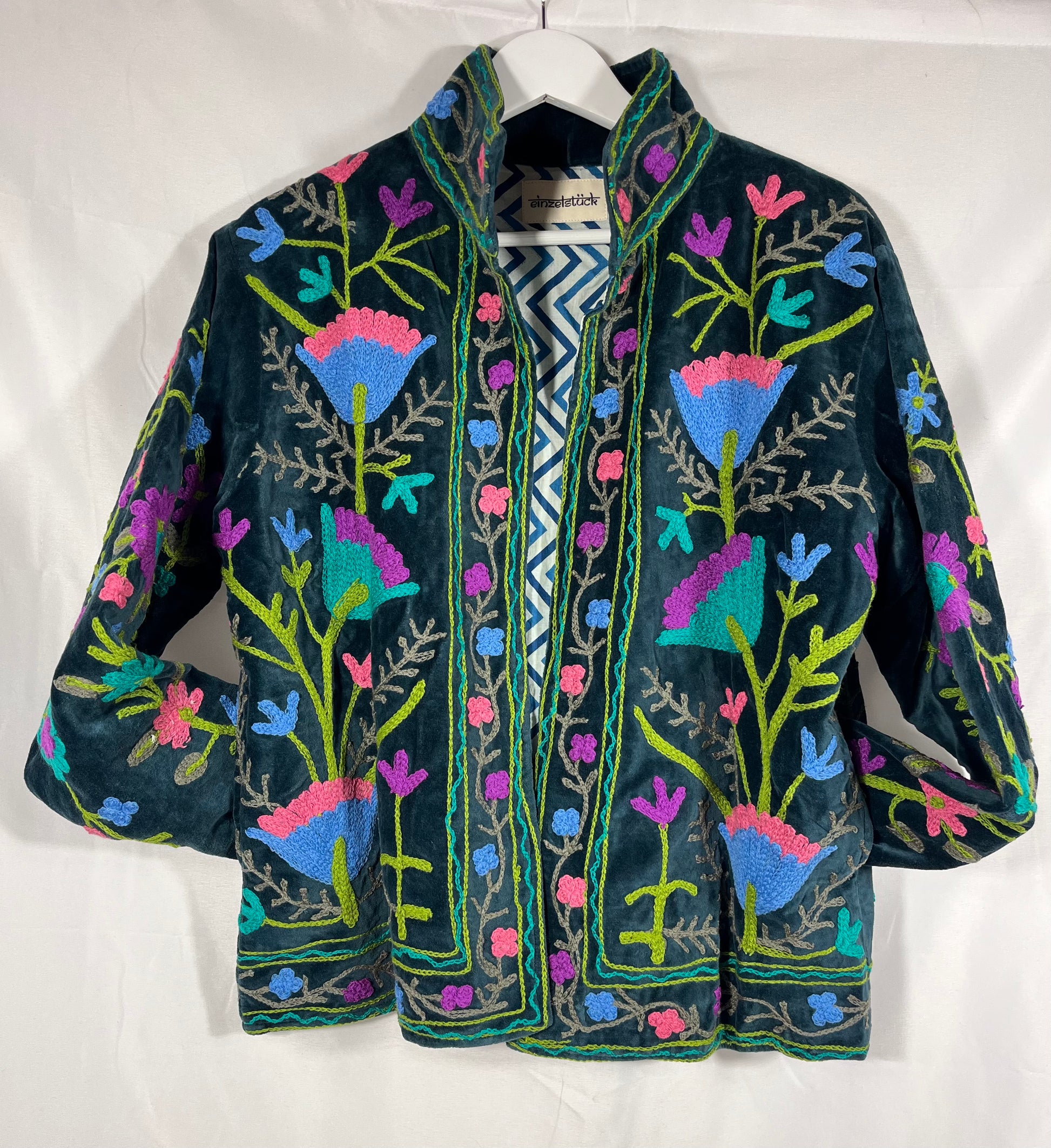 Dieses Einzelstück ist genäht aus einem alten bestickten Suzani. Die Jacke hat zwei Taschen und das Innenfutter ist aus weicher Baumwolle.
